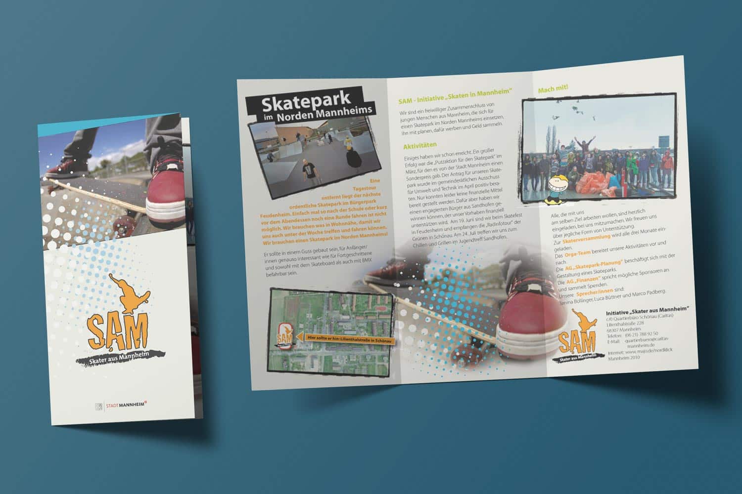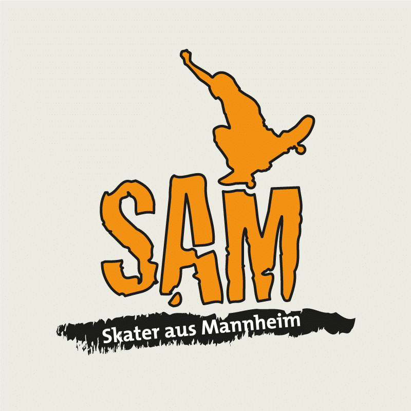 SAM „Skater aus Mannheim“ ist die Initiative von jungen Menschen aus Mannheim, die sich für einen Skatepark im Norden Mannheims einsetzten, ihn mit planten, dafür warben und Spendengelder sammelten. Unterstützt wurde die Initiative von der Kinderbeauftragten der Stadt Mannheim. Ich wurde mit der Logoentwicklung, der Konzeption, Gestaltung und Umsetzung weiterer Kommunikationsmittel beauftragt.
