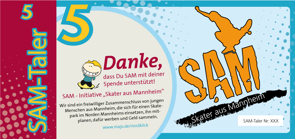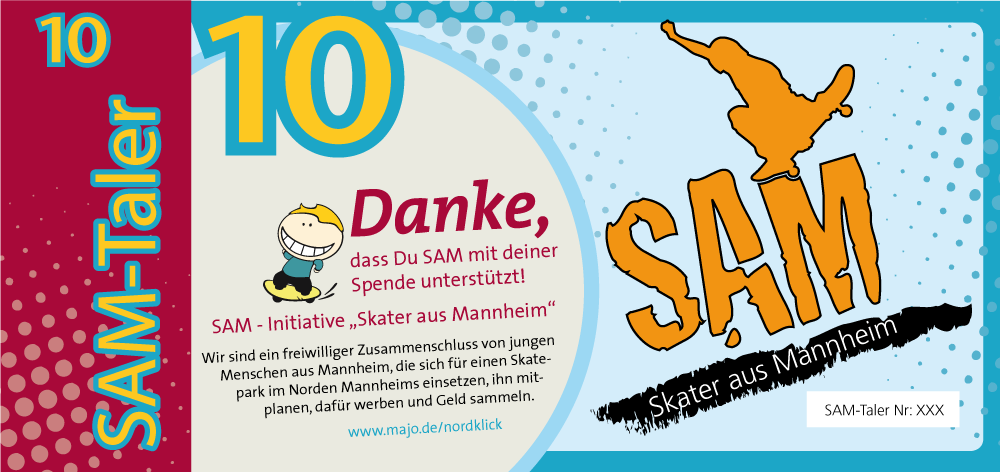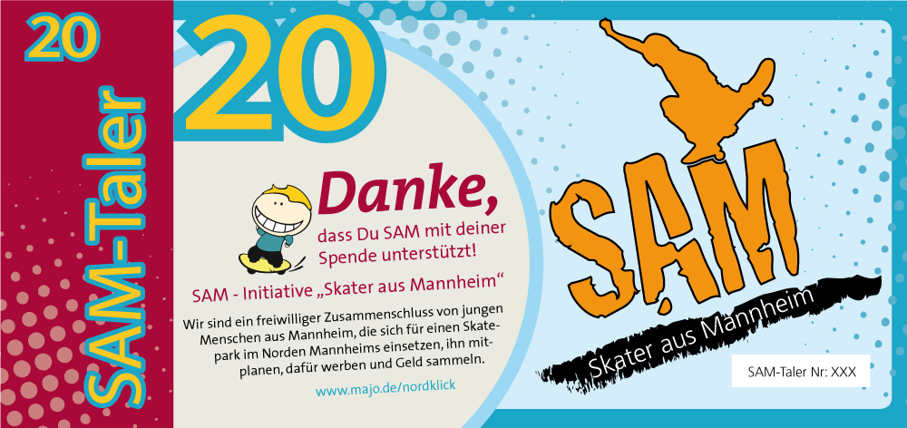 Für das Spendensammeln wurde der „SAM-Taler“ als Giveaway/weiteres Infomaterial erstellt. Der Einsatz hat sich gelohnt. Durch viele Aktionen, bei denen die Kommunikationsmittel zum Eisnatz kamen, wurde das Interesse bei den Menschen geweckt und viele Spenden gesammelt. Am Ende hat der Mannheimer Gemeinderat grünes Licht gegeben und der Skatepark wurde nach den Wünschen der Skater gebaut. Ein voller Erfolg!